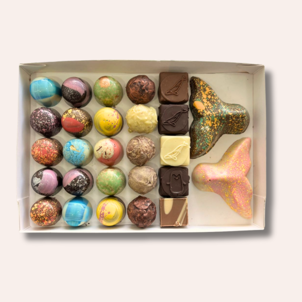 Este box reúne lo mejor de nuestra pastelería: bombones, trufas, bombones de corte… y nuestras icónicas colitas de ballena rellenas de dulce de leche, que hacen de esta caja un verdadero tesoro patagónico.