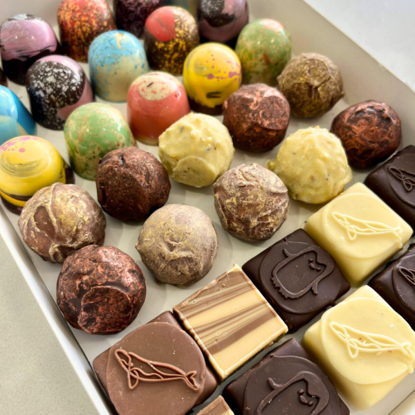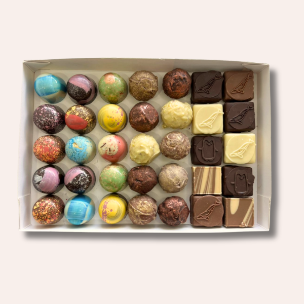 Delicias artesanales presentadas en una caja hermosa, ideal para regalar, compartir o disfrutar sin medida. Una selección cuidada con lo mejor de nuestra pastelería: bombones, trufas y bombones de corte, todos pintados a mano y rellenos con lo que mejor sabemos hacer.