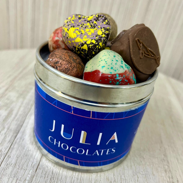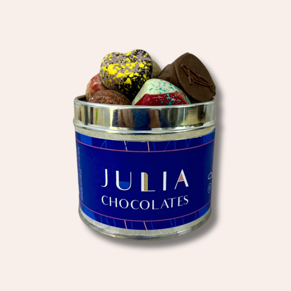 Nuestra lata surtida incluye una selección de bombones y trufas artesanales, elaborados con distintos chocolates, rellenos y texturas. Cada unidad es única: pintada a mano, creada en nuestra pastelería y siempre diferente.