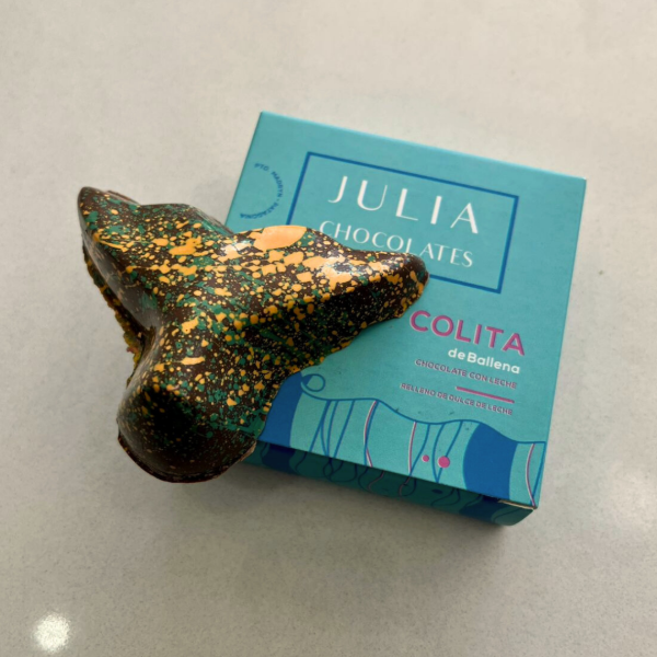 Esta colita de ballena está elaborada con chocolate con leche, rellena de dulce de leche y decorada a mano con colores vibrantes que cambian semana a semana. Es uno de nuestros recuerdos comestibles más elegidos, ideal para regalar o disfrutar como bocado único.