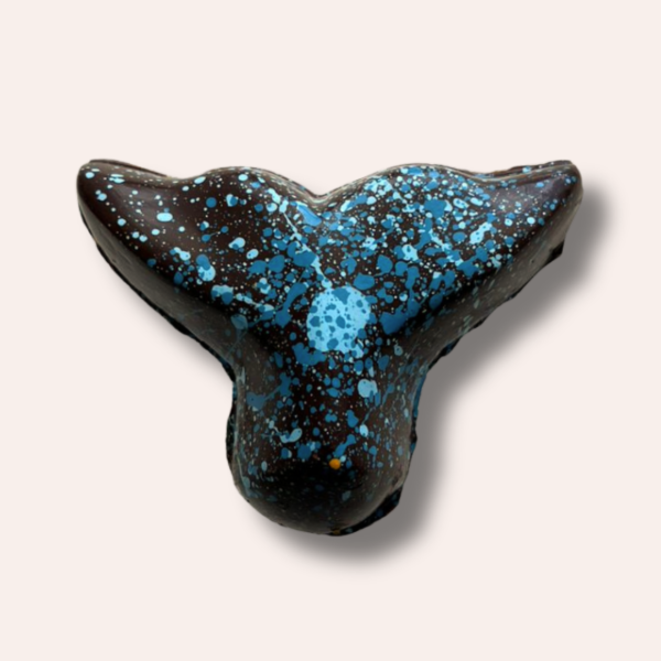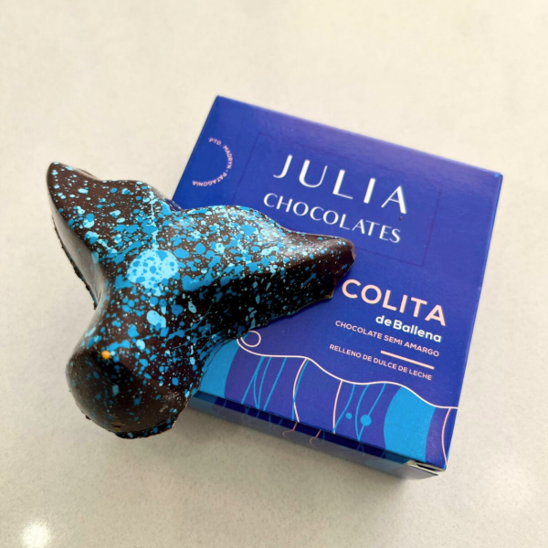 Nuestra colita de ballena es uno de los íconos de Julia Chocolates: elaborada con chocolate semi amargo, rellena de dulce de leche y pintada a mano con colores que varían cada semana.