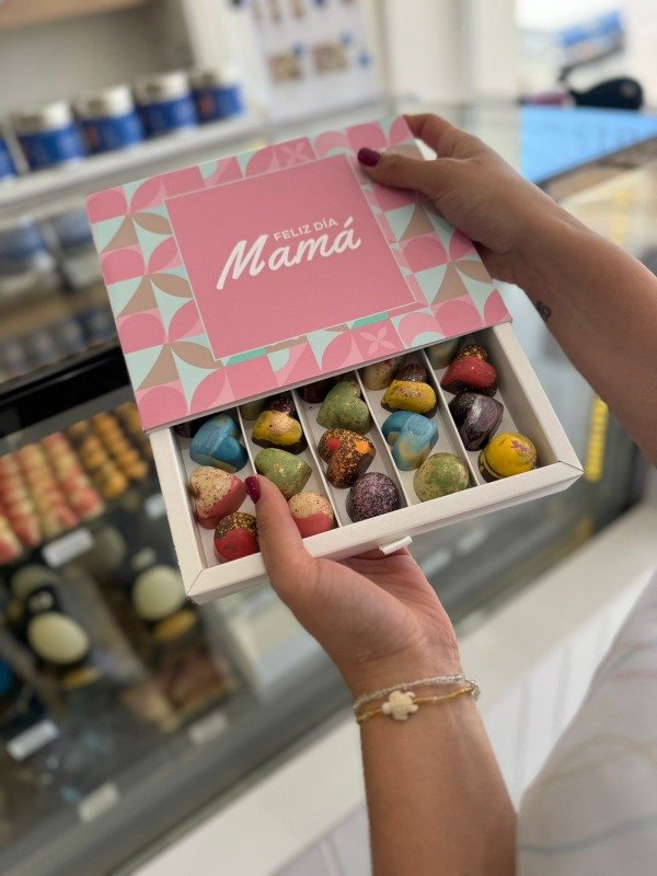 25 bombones pintados a mano, con rellenos que elegimos especialmente para esta edición limitada del Día de la Madre.